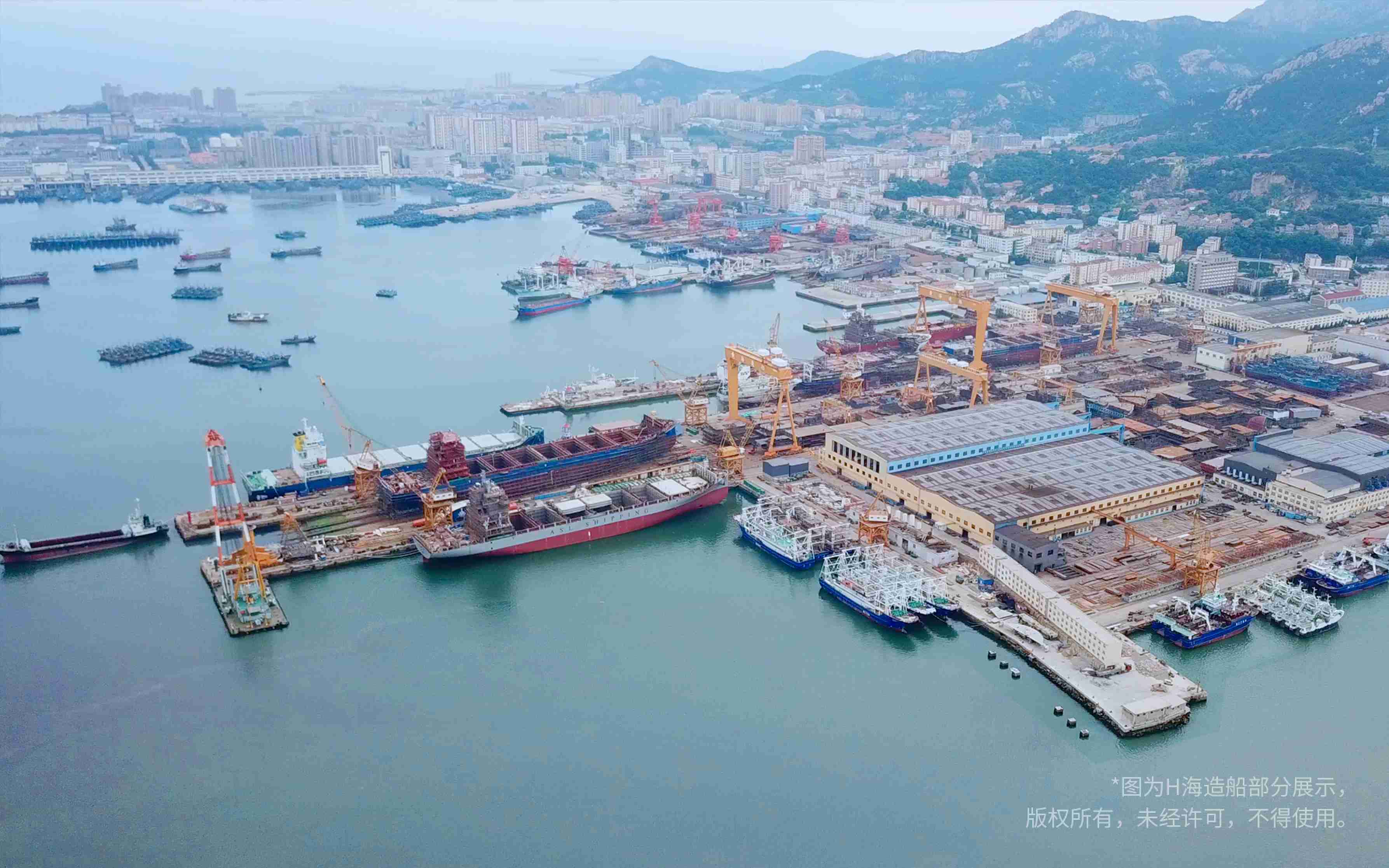 正值7月,流金鑠石,一艘艘正在建造的輪船沿海岸線排開,在H海造船有限公司的船塢和港池內擺出了“巨人陣”。